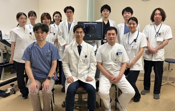 心エコー班では、初期研修医および後期研修医(医師3年目のローテーター)、医学生、技師さんに対して、経胸壁心エコー研修を行なっています。研修は、心エコー班の医師が指導し、研修医一人当たり30分ほどの検査時間で行っています。研修目標は、緊急時に必要な経胸壁心エコー検査を独力で行えることとし、初回研修は各アプローチでの正しい描出、2回目では各種ドプラーエコーの撮り方・評価の仕方のマスター、3回目は各種計測のマスター、以降は様々な疾患の診断を行うことなどを目標に行なっています。研修医には、画像を描出することだけでなく、心臓の構造や循環動態を理解しながら検査を行うよう意識してもらい、検査の手技を覚えるだけでなく、循環器疾患の病態を理解するよう指導しております。希望者は、他科の医師、学外の医師、技師さんも参加可能です。